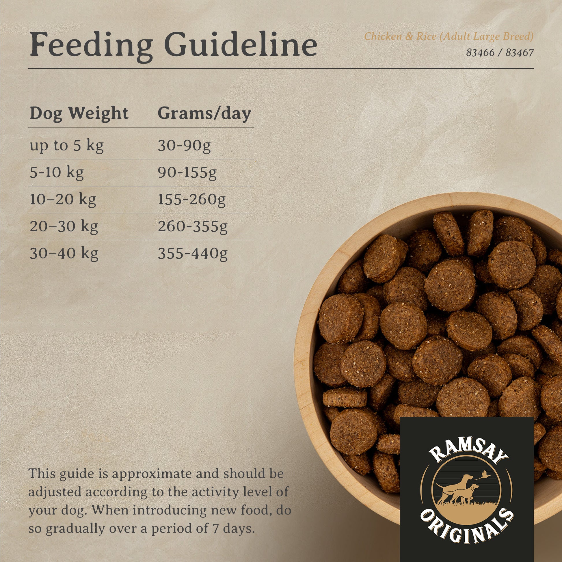 Our Ramsay Originals Large Breed Adult Chicken & Rice recipe is highly palatable using a single protein source, as well as rice, glucosamine, chondroitin and yucca extract to create a hypoallergenic dry food that is free from gluten to help digestion, joints and improve skin and coat issues. It is free from wheat and wheat-gluten, with no added artificial colours, flavours or preservatives. With only the highest quality ingredients used, our Ramsay Originals Gluten Free range is a complete and balanced recipe that provides all the nourishment that your dog needs to enjoy optimal health and vitality.